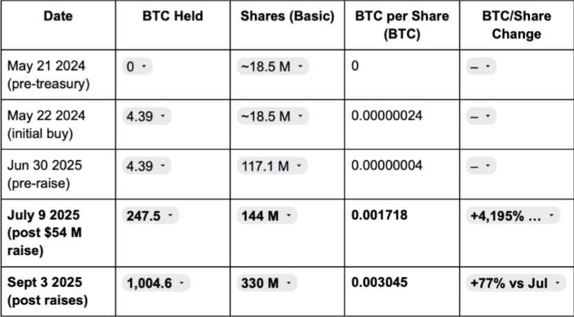 - After Sept 3, 2025 raise & buy: 1,004.6 BTC / ~330 M shares = 0.00305 BTC/share. Accretion: +7% vs pre-Sept.