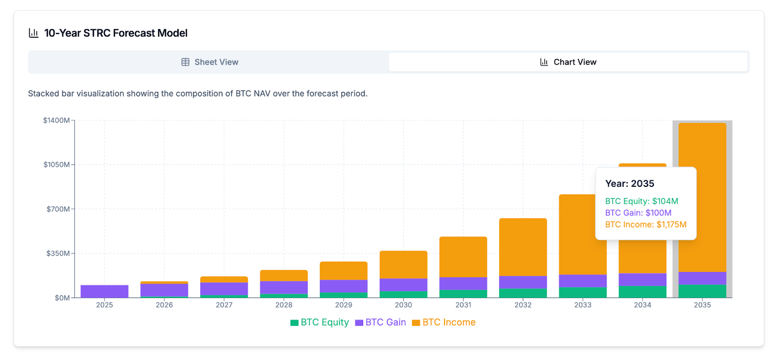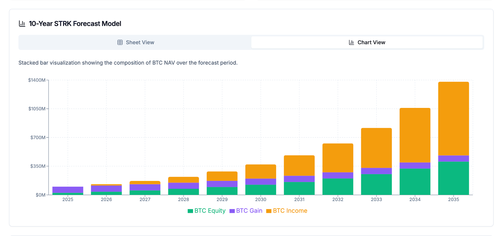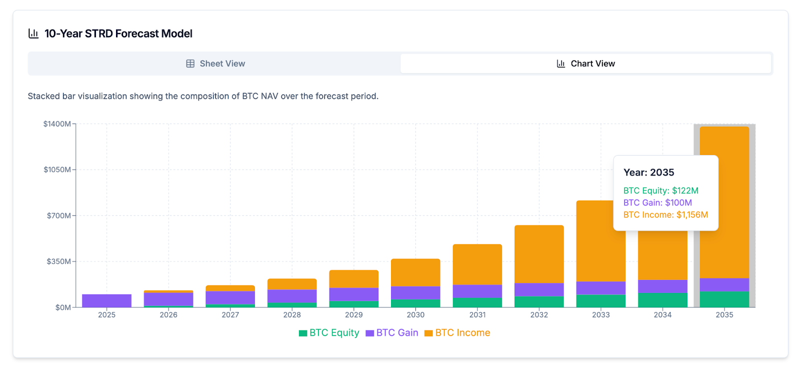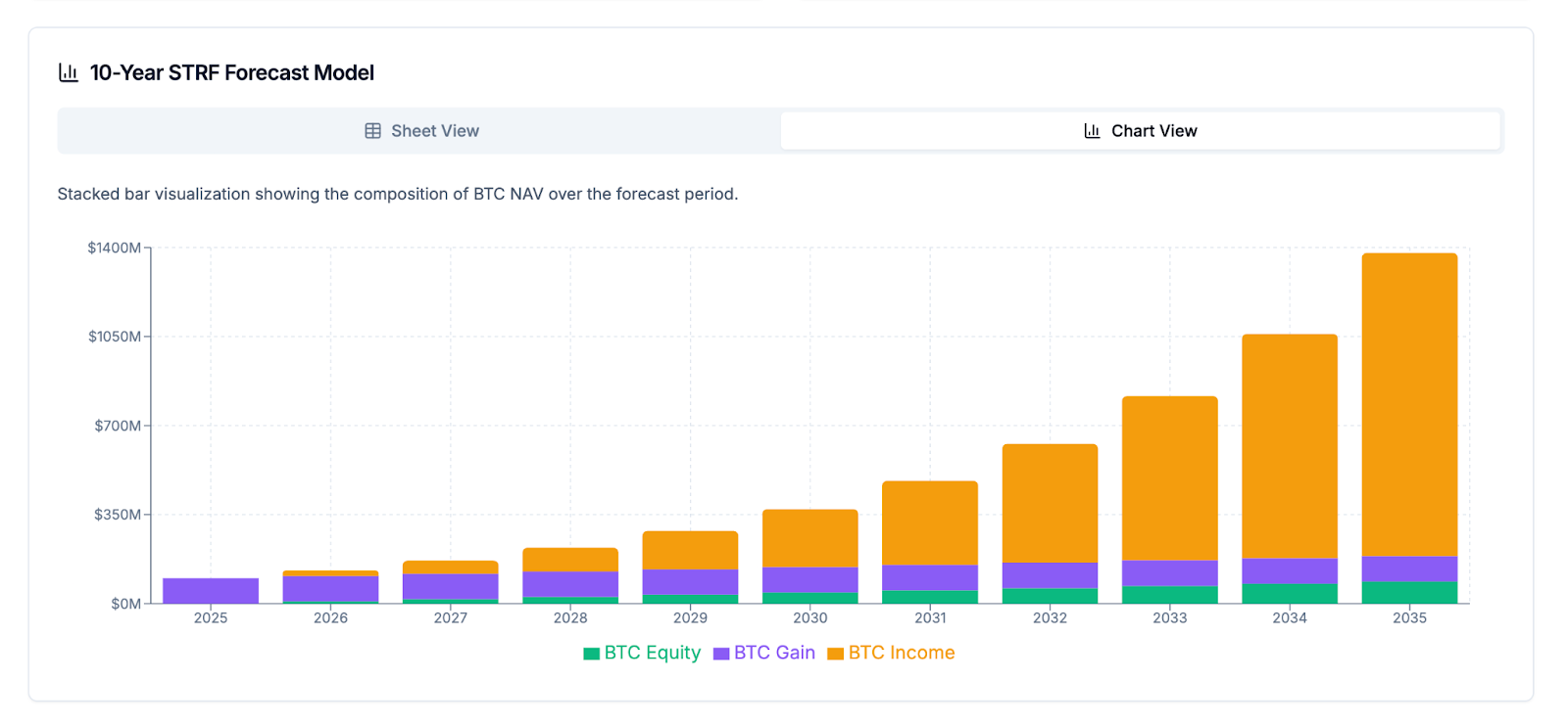 A 10-year forecast model for STRD projects a net Bitcoin return of $1,256M, which showcases the long-term value creation potential of this instrument. The forecast model demonstrates how STRD contributes to the overall growth of Bitcoin Net Asset Value over the forecast period. The mNAV Equivalent graph for STRD further illustrates its long-term strategic advantage by showing a consistent increase in its effectiveness over time.