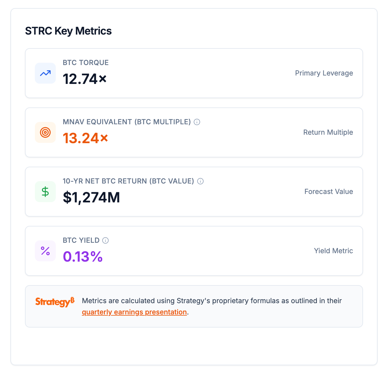 - To quantify the efficiency and potential of this instrument, the company has applied its proprietary financial models to STRC under a "Maximalist" scenario. The results highlight its superior performance compared to all other financing instruments, including common equity and convertible notes. The STRC security generates a BTC Torque of 12.74x. This figure is slightly higher than even the highly efficient STRF preferred stock, reaffirming that STRC is the most effective tool for generating value for common shareholders on a per-share basis.