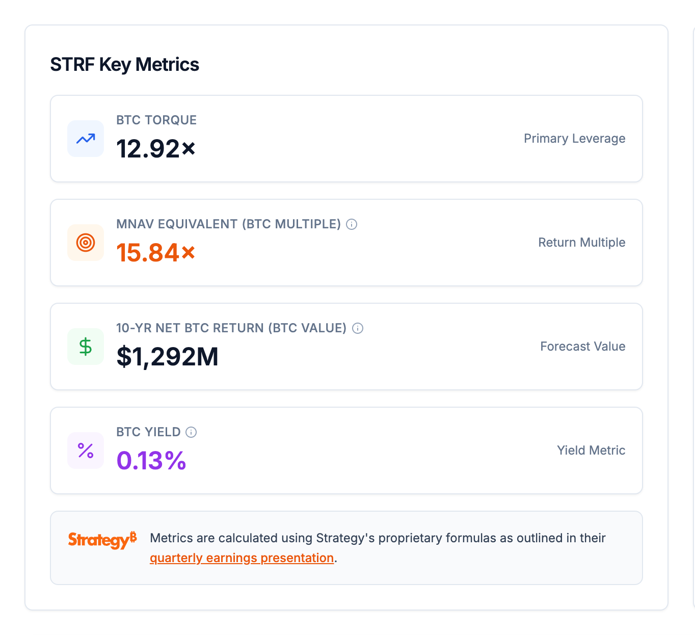 - BTC Torque: This is a central metric for proving the efficiency of the company's leverage strategy. BTC Torque is defined as the ratio of BTC $ Value created to the BTC Capital invested. A high BTC Torque demonstrates that a capital raise is generating a disproportionately large amount of value for shareholders.