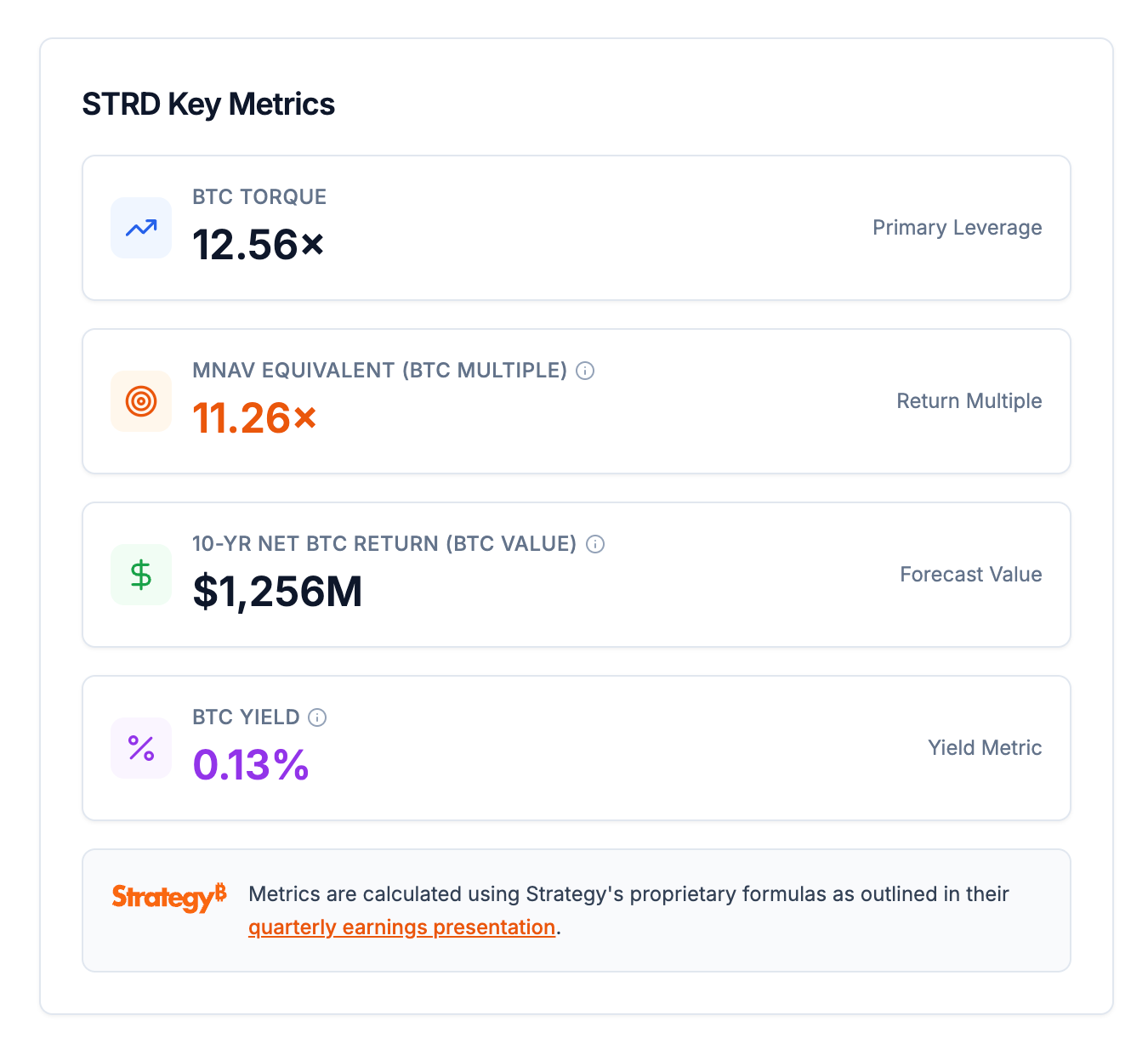 The STRD perpetual preferred stock is specifically designed to attract capital from the high-yield credit market. The company has applied its financial models to this security to quantify its value-creation capabilities. Key metrics for STRD under a "Maximalist" scenario show a BTC Torque of 12.56x, which is a powerful indicator of its capital efficiency. The mNAV Equivalent (or BTC Multiple) for STRD is calculated at 11.26x, which simulates the mNAV that a common stock ATM would need to achieve to match STRD's cumulative BTC Gain and BTC Income.