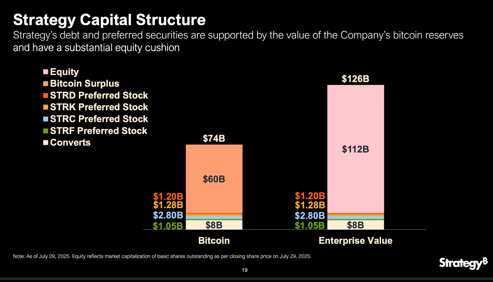 The viability and appeal of the company's entire capital structure are underpinned by the enormous value of its Bitcoin treasury. This section quantifies Bitcoin's role as a superior form of collateral. As of July 29, 2025, the company held 628,791 bitcoins, with a BTC NAV of approximately $74 billion. This massive asset base underpins an enterprise value of approximately $126 billion, leaving a substantial $112 billion equity cushion for common shareholders after accounting for debt and preferred obligations. This demonstrates an unparalleled level of over-collateralization.