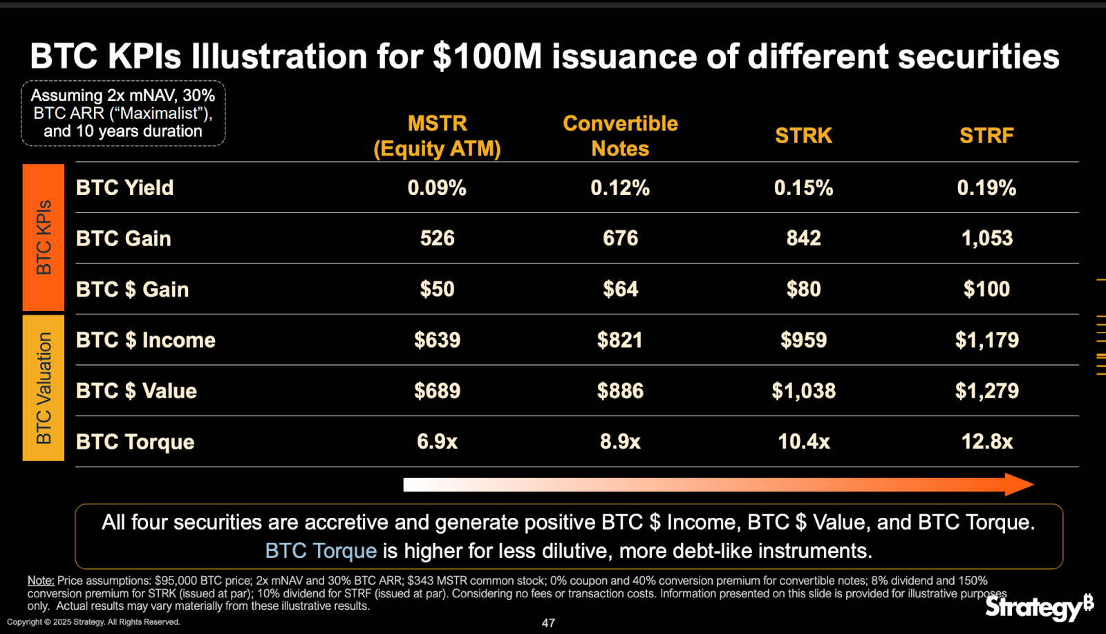 A core thesis of the company's financial strategy is that its perpetual preferred stocks can generate superior returns on capital when compared to its convertible notes or common equity. This is quantitatively demonstrated through the company's proprietary BTC Torque model. A comparative analysis of the various capital instruments reveals a clear relationship between the degree of dilution and the capital efficiency of a given financing.