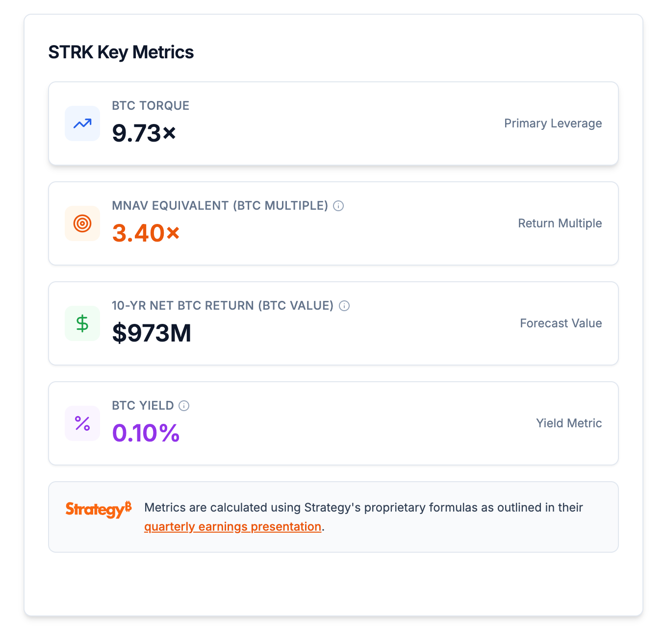 The STRK preferred stock is a unique hybrid security that combines a fixed 8% dividend with a conversion right into the company's common stock, targeting growth-oriented income investors. The company's financial models quantify STRK's value-creation capabilities, demonstrating its strategic position in the tiered suite of perpetual preferred stocks.Under a "Maximalist" scenario, the STRK security generates a BTC Torque of 9.73x. While this is lower than the more debt-like STRC and STRD securities, it is significantly higher than the BTC Torque generated by common equity and even traditional convertible notes, validating its capital efficiency.