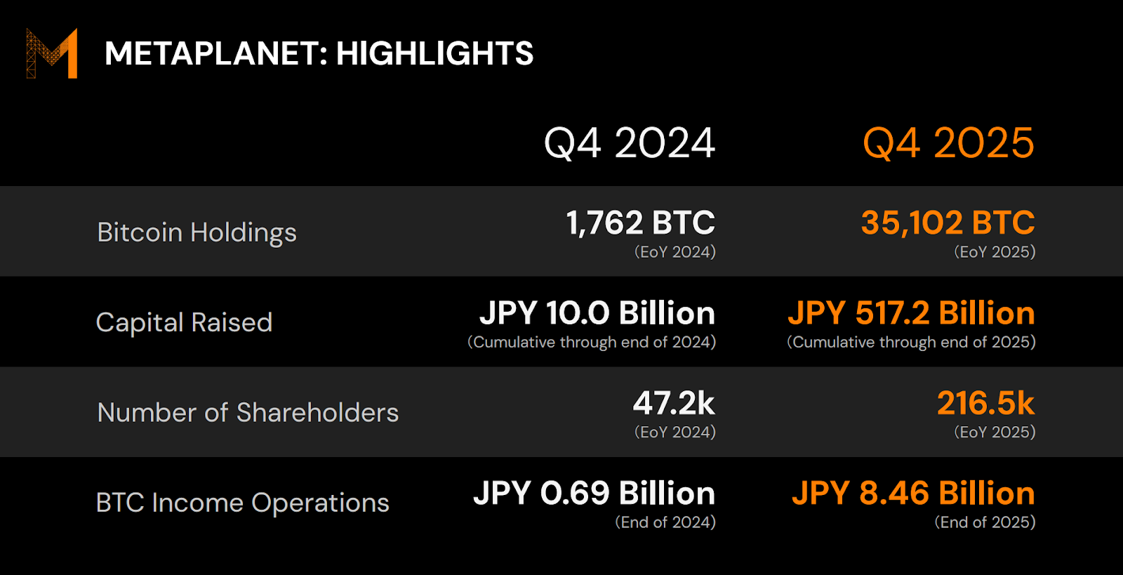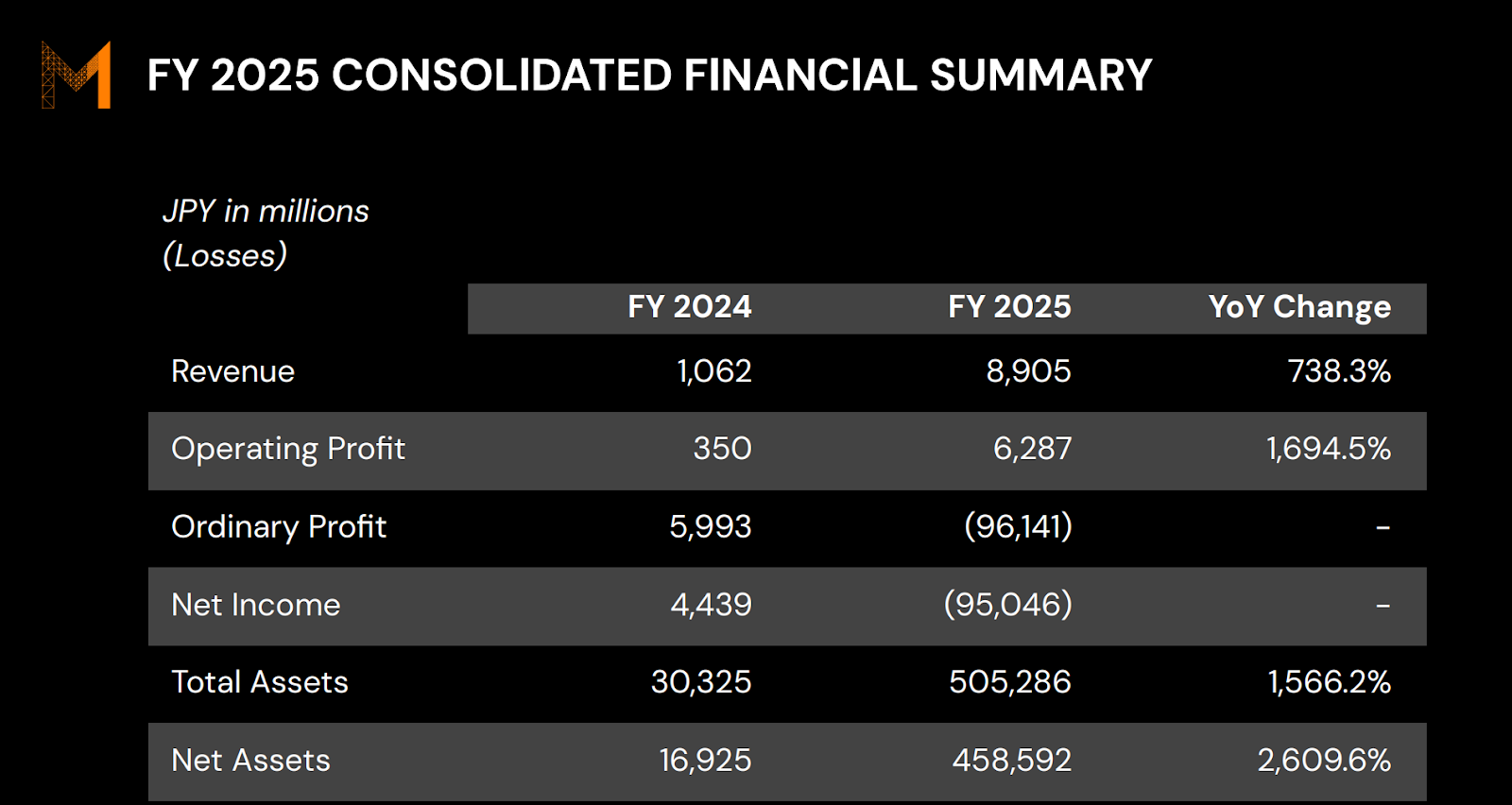 In twelve months, total assets expanded from ¥30.3 billion to ¥505.3 billion a 16-fold increase. Net assets surged to ¥458.6 billion. Bitcoin holdings rose from 1,762 BTC to 35,102 BTC.