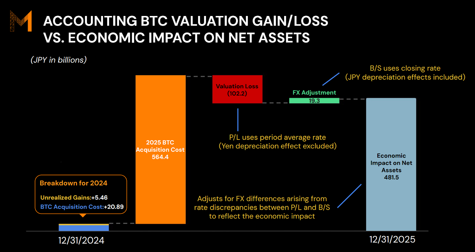 Under Japanese GAAP, Bitcoin is marked to market through profit and loss. When prices softened in Q4, accounting losses followed.