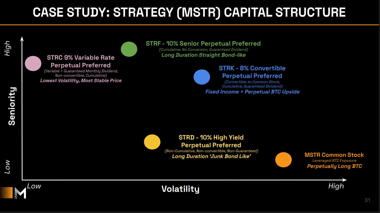 Multi-Class Perpetual Preferred Structures: In early-to-mid 2025, Strategy issued several series of perpetual preferred stocks, each with distinct features targeting different investor segments. These were nicknamed STRF, STRC, STRK, and STRD (collectively termed “Strategy’s preferreds”), and they essentially tiered the capital structure above common equity: