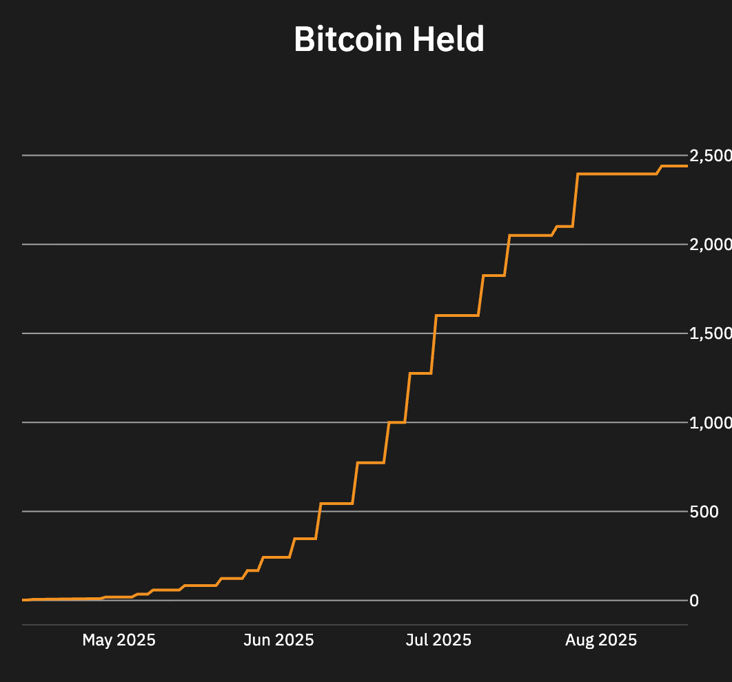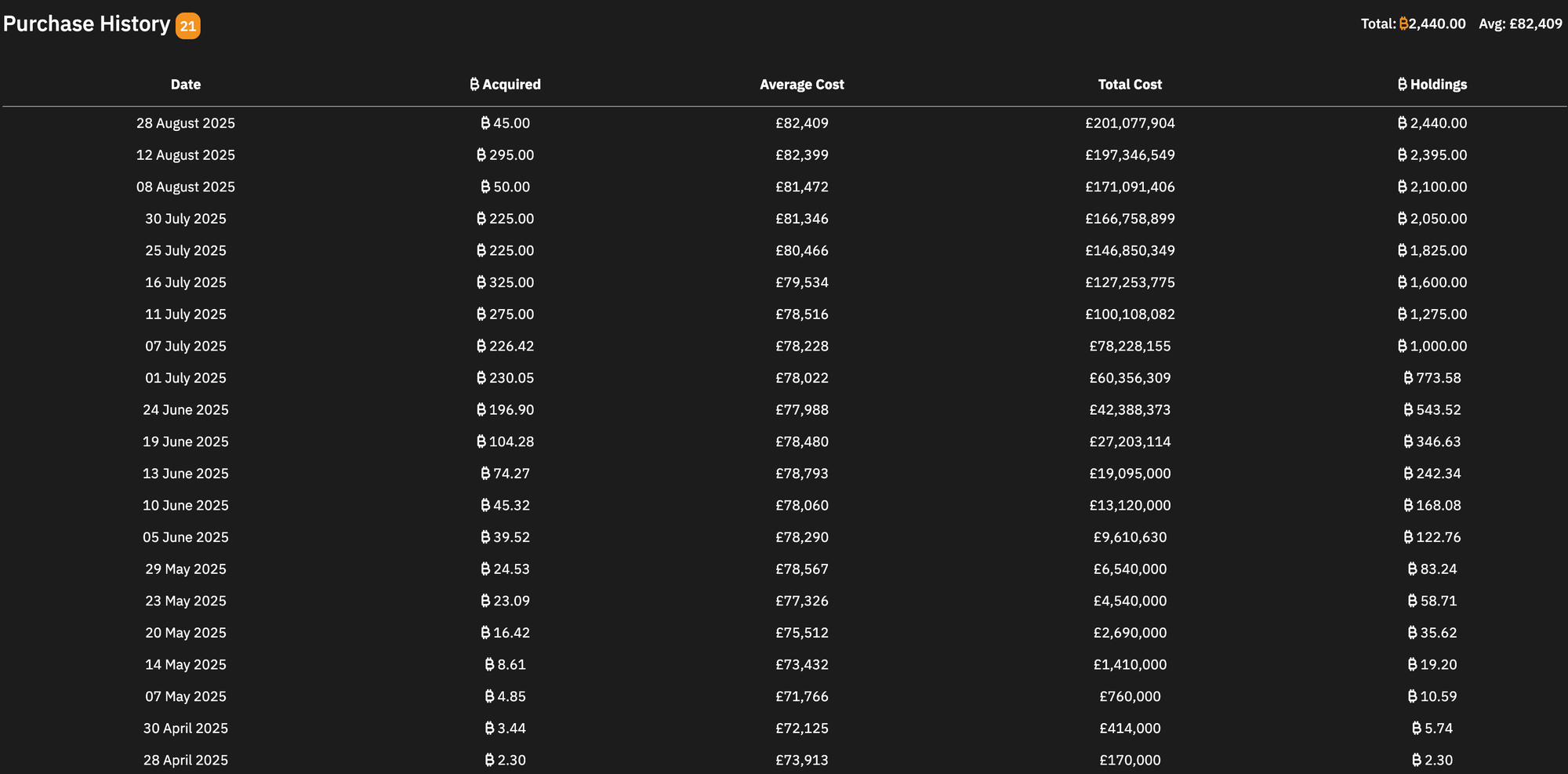 - August 8, 2025: +50 BTC at £86,650 → treasury = ~2,100 BTC.