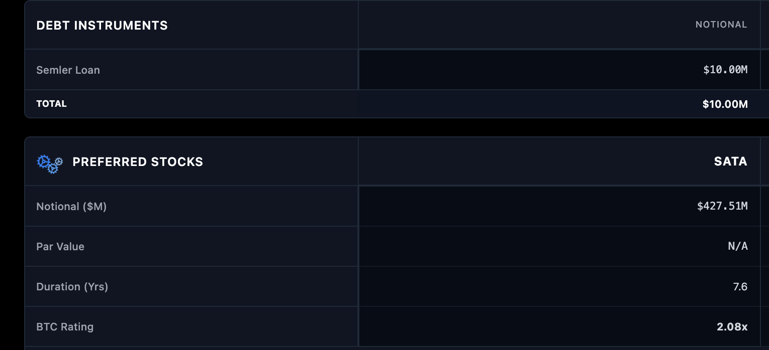 In a liquidation or restructuring context, the amount and complexity of senior claims matter enormously. A preferred stock with a lower BTC Rating but fewer claims ahead of it may, in some scenarios, look more attractive than a preferred stock with a stronger Bitcoin cushion but a much heavier senior stack. That does not automatically make SATA safer. It does mean the structure deserves more credit than a superficial comparison might suggest.