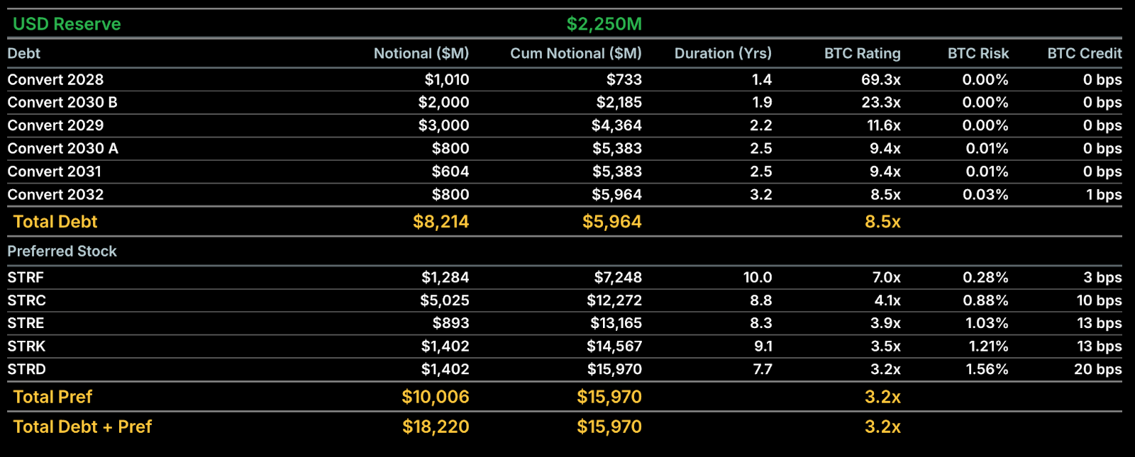 Capital structure matters too. And here SATA has a credible counterargument. While SATA’s BTC Rating is lower, it is supporting a structure with comparatively little senior debt. STRC, by contrast, sits beneath a very large layer of senior convertible obligations. Investors therefore face a real trade-off: do they prefer the larger Bitcoin cushion of STRC, or the simpler and cleaner repayment hierarchy of SATA?