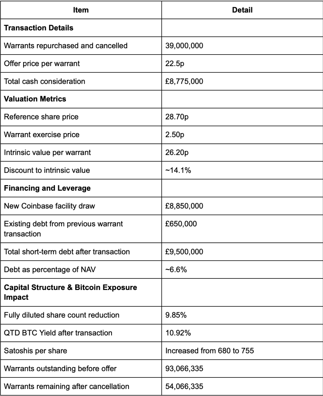 SWC bought and cancelled 39,000,000 Pre-IPO Warrants at 22.5p per warrant. The total cash cost was £8,775,000. The company funded the purchase by drawing £8,850,000 from its Coinbase Strategic Credit Facility, which brought total short-term debt to £9,500,000, equal to approximately 6.6% of NAV.