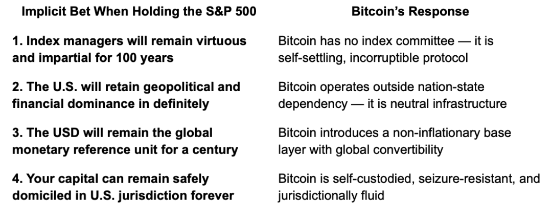 Bitcoin simultaneously breaks all four assumptions, offering a bearer instrument with no management fee, no dilution, no political dependency, and infinite monetary duration. As this realization scales, every fiat equity index — including the S&P 500 — begins to reprice downward in BTC terms.