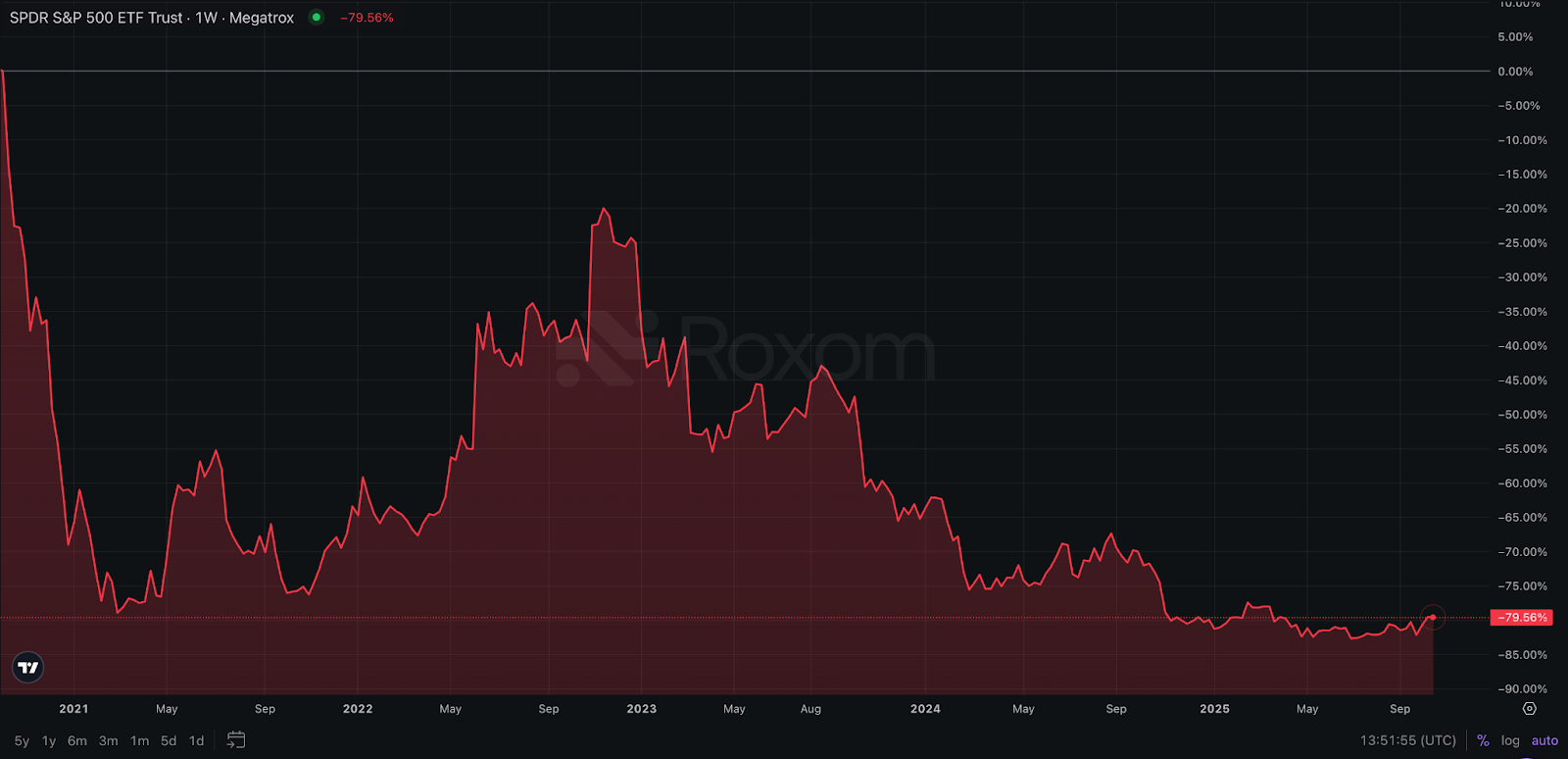 Since 2021, the S&P 500 has lost nearly 80% of its value when measured against Bitcoin, a drawdown that makes every traditional bear market in fiat terms look trivial by comparison. And unlike past corrections, this isn’t a cyclical rotation. It is a denominator revolution.