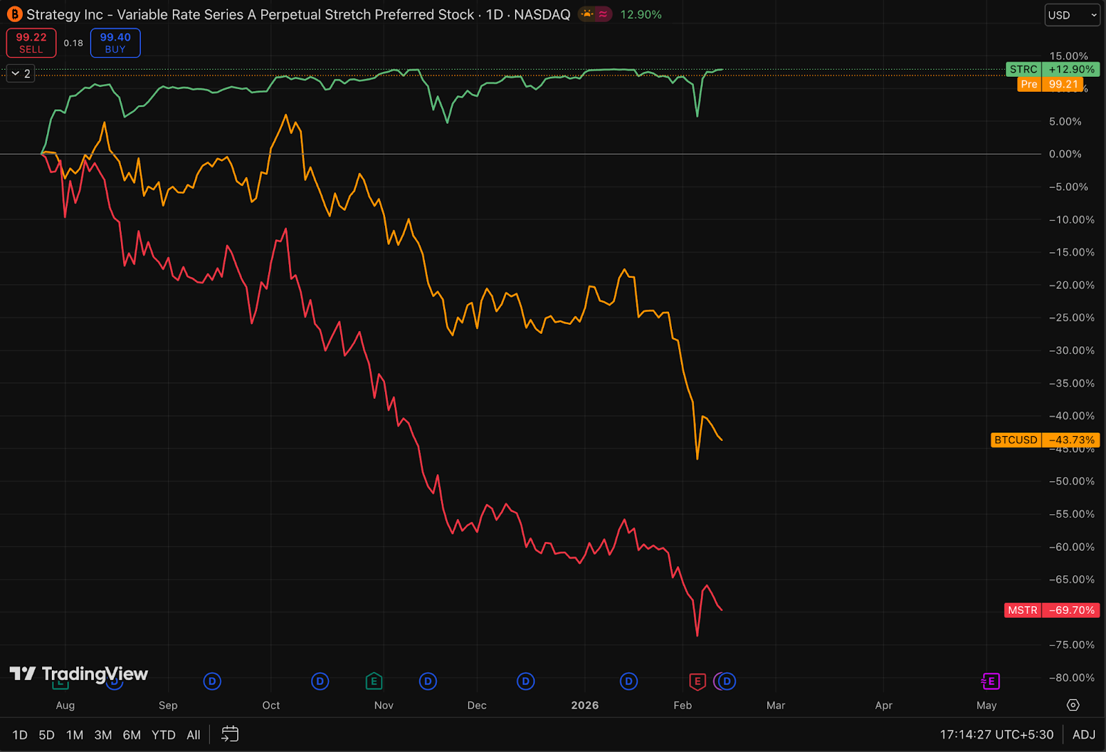 In that environment, the obvious expectation is that all “Bitcoin-adjacent” risk assets especially those issued by the largest Bitcoin Treasury Company should reprice sharply. MSTR common did. STRC largely didn’t.